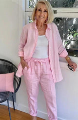 Polyvalence et Élégance : Ensemble Décontracté Féminin en Lin et Coton avec Boutons et Manches Longues